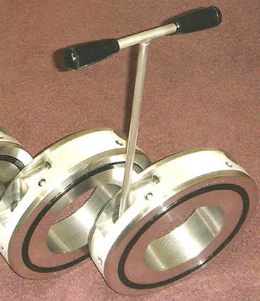 用簡單的"T型手柄"旋轉"加壓螺杆"來壓入"加壓活塞"。這時,密封液壓增高而擠壓出"環形活塞"並以此來緊固旋轉工具(墊圈、刀具等)。同時,可以確認"推力指示器"的刻度是否為所定推力值。不需要使用以往液壓螺母似的價高、易壞的扭矩扳手。